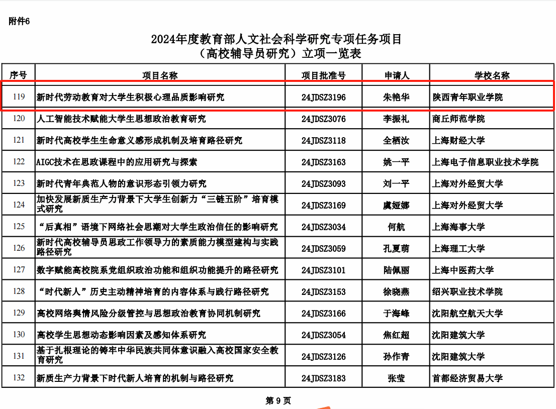 近日,由教育部社会科学司组织的2024年度教育部人文社会科学研究专项任务项目(高校辅导员研究)立项结果正式公布,我校辅导员朱艳华申报的项目《新时代劳动教育对大学生积极心理品质影响研究》获批立项。