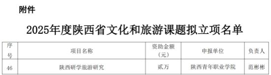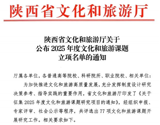 近日,陕西省文化和旅游厅发布《关于公布2025年度文化和旅游课题立项名单的通知》,我校范彬彬老师主持的“陕西研学旅游研究”课题获批立项。